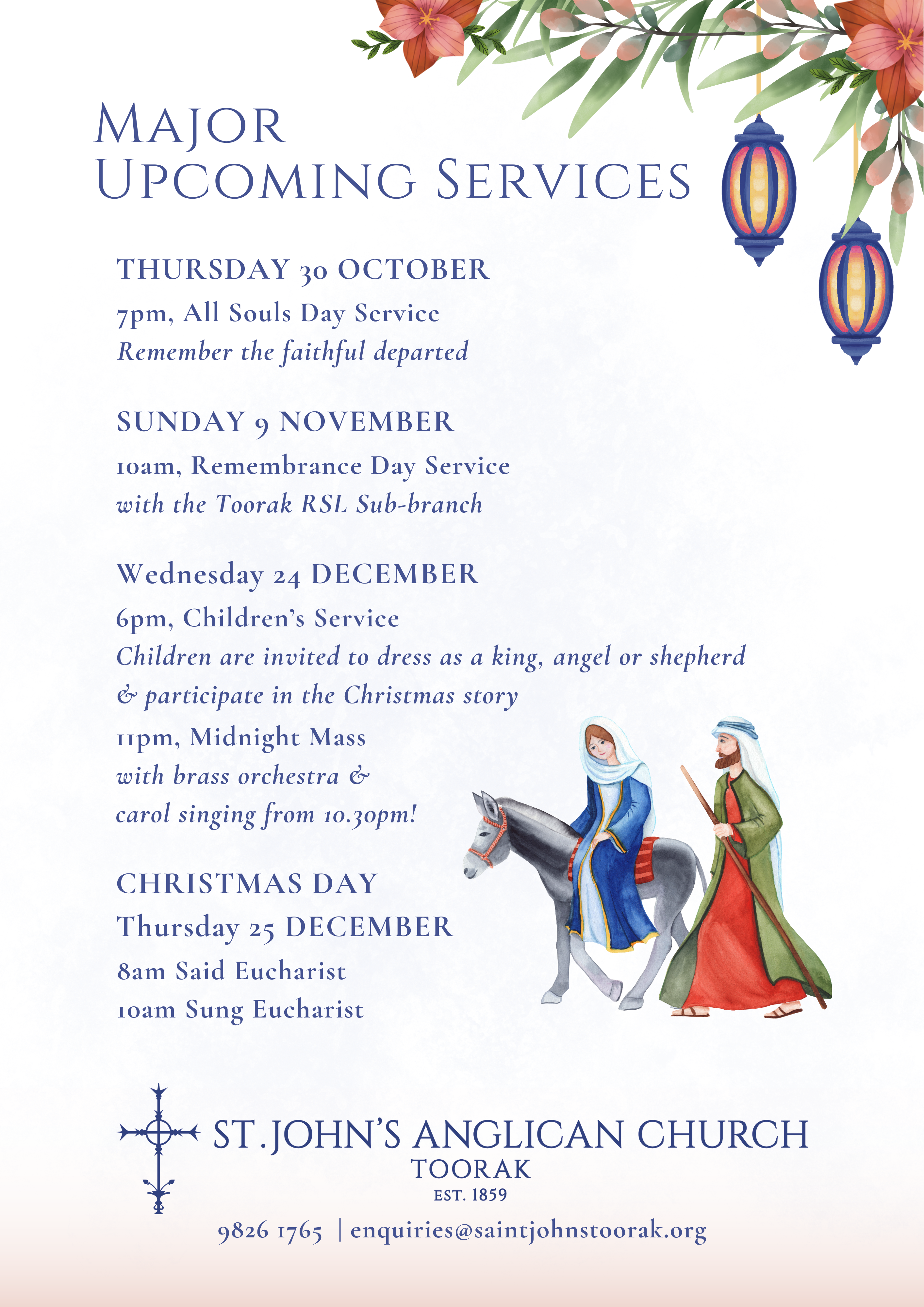We acknowledge that St. John’s Toorak is on the traditional land of the Boon Wurrung and Wurundjeri people and offer our respects to elders past and present. We recognise and respect the cultural heritage of this land and the ongoing work of reconciliation.