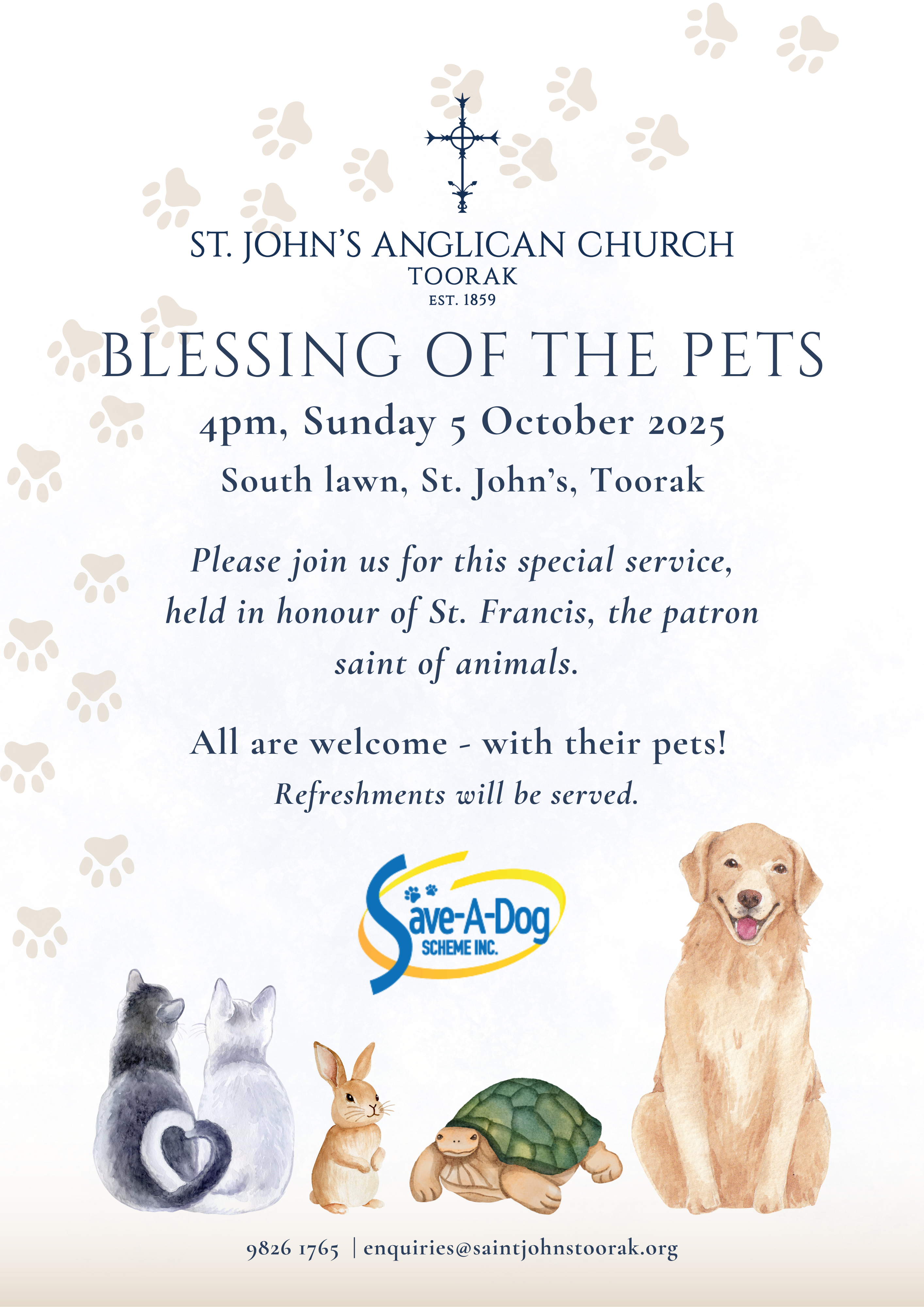 A favourite afternoon in the St. John’s calendar is the annual blessing of the pets service, held in honour of St. Francis (the patron saint of animals). All are welcome – with their pets! – to gather on the South Lawn for a service of prayer and blessing and for time together with our animals. Drinks will be served. We need two volunteers to help with the success of the day – please contact the Parish Office if you can help.