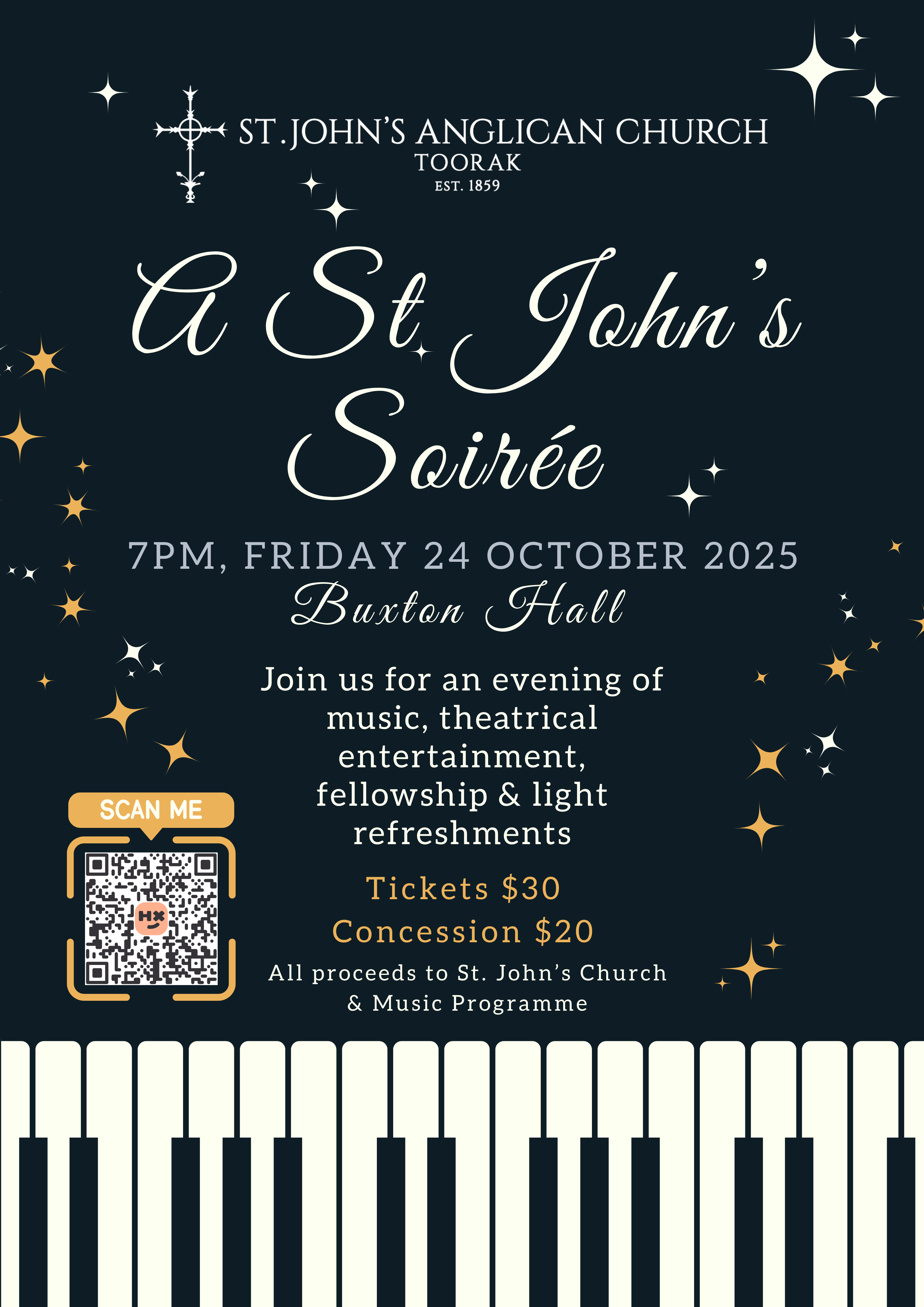 Join us for a wonderful evening of music, theatrical entertainment, fellowship and light refreshments. Invite your family and friends. All are welcome. Tickets are $30. Concession $20. All proceeds to St. John’s Church & Music Programme. Book here!